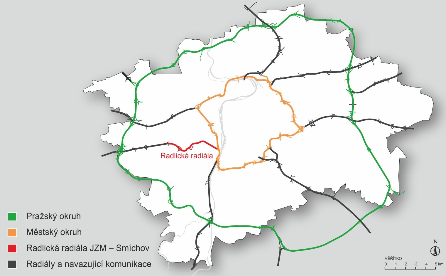 Radlická radiála ve svém výsledném řešení plní funkci hlavní sběrné komunikace pro prostor Radlic, Jinonic a Jihozápadního města. Prodloužením Rozvadovské spojky propojuje silniční a městský okruh. Prochází v západo-východním směru celým řešeným územím a prostřednictvím pěti mimoúrovňových křižovatek je napojena na nižší místní komunikační síť (MÚK Bucharova, MÚK Řeporyjská, MÚK Butovice a MÚK Jinonice) a v MÚK Zlíchov na městský okruh v prostoru Zlíchovského tunelu.