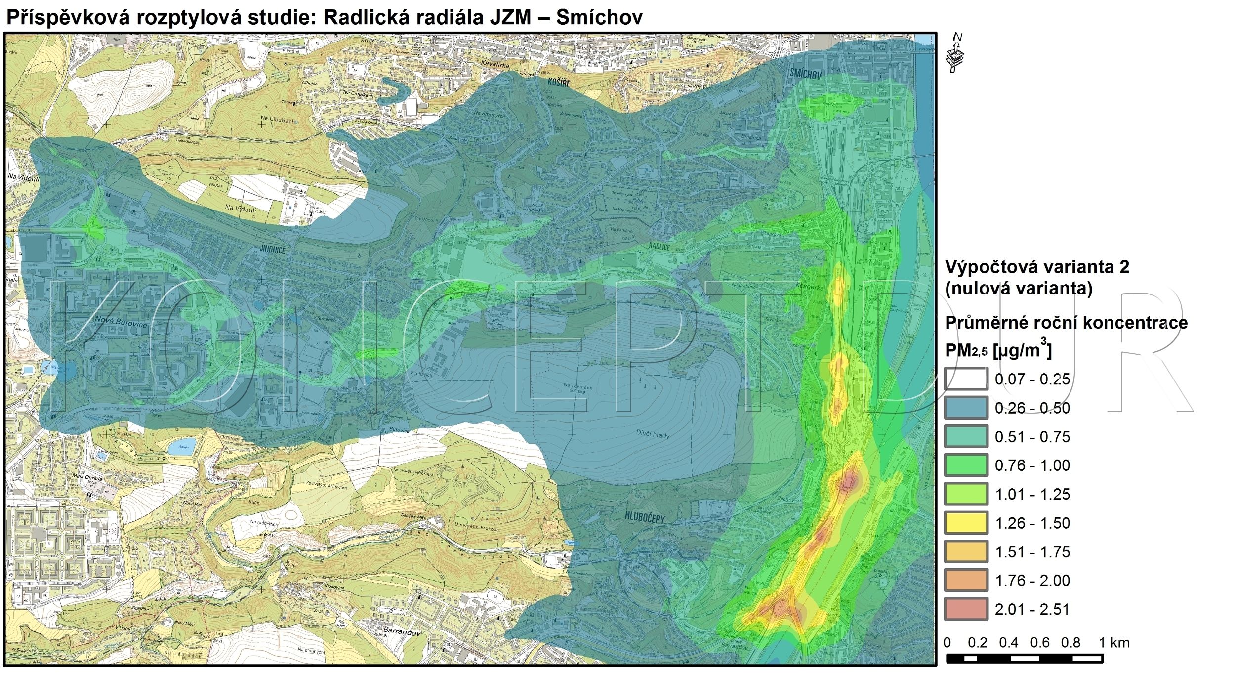 Radlická radiála JZM – Smíchov, stavba č. 9567: imise – nulová varianta – průměrné roční koncentrace PM2,5