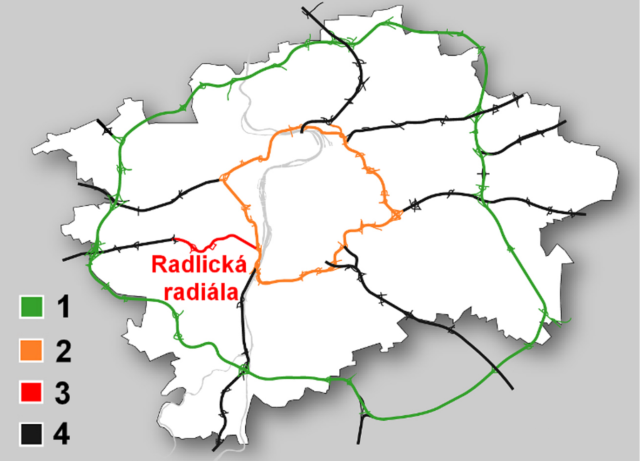 1 – Pražský okruh, 2 – Městský okruh, 3 – Radlická radiála JZM – Smíchov, 4 – Radiály a navazující komunikace
