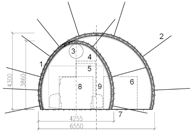 1 – primární ostění ze stříkaného betonu s 2 KARI sítěmi a příhradovým rámem, 2 – radiální svorník délky 2 m, 3 – lutnový tah, 4, 5 a 6 – profily strojů, 7 – dno štoly bez výztuže, 8 – osa štoly, 9 – osa výhybny