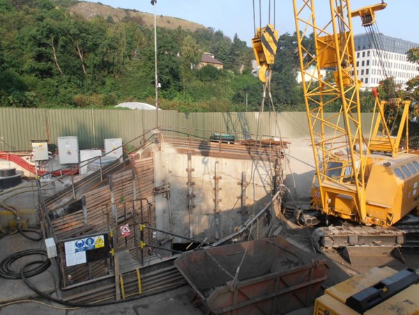 Z výškových důvodů byla realizace navržena z těžní šachty hloubky cca 12 m. Geometrie těžní šachty respektuje předpokládanou technologii svislé dopravy a místní, poměrně stísněné podmínky. Zajištění ostění šachty je navrženo kotveným záporovým pažením z ocelových válcovaných profilů I 220 délky 9,0 m v kvartérních sedimentech a stříkaným betonem tl. 100 mm se sítěmi 150x150x6,3 mm a ocelovými svorníky ve skalním prostředí.
