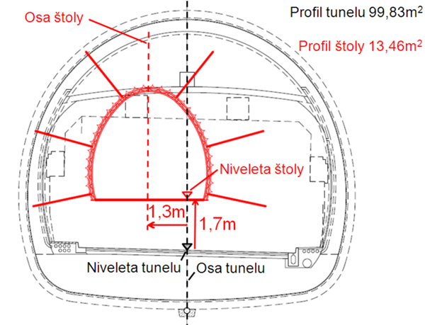 Obr. 4 Umístění štoly v příčném profilu budoucího tunelu