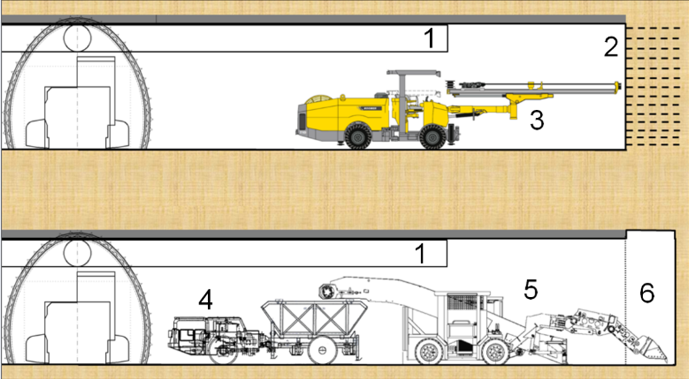 1 – Lutnový tah, 2 – čelba s vývrty pro trhací práce, 3 – vrtací stroj Boomer TD-1, 4 – důlní vozidlo PAUS Universa, 5 – kolový kontinuální nakladač Haggloader 7HR-B